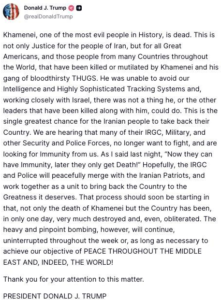 ด้านประธานาธิบดีโดนัลด์ ทรัมป์ ของสหรัฐฯ โพสต์ข้อความบนทรูธโซเชียล ระบุว่า คาเมเนอี หนึ่งในบุคคลที่ชั่วร้ายที่สุดในประวัติศาสตร์ เสียชีวิตแล้ว โดยไม่ได้เปิดเผยแหล่งที่มาของข้อมูล พร้อมเสริมว่า นี่ไม่ใช่เพียงความยุติธรรมสำหรับประชาชนอิหร่านเท่านั้นแต่ยังเพื่อชาวอเมริกันผู้ยิ่งใหญ่ทุกคน และผู้คนจากหลายประเทศทั่วโลกที่ถูกคาเมเนอีและพวกอันธพาลกระหายเลือดของเขาฆ่าหรือถูกทำร้ายจนพิการ ทรัมป์ กล่าวด้วยว่า ประเทศนี้ถูกทำลายอย่างหนักภายในเวลาเพียง 1 วัน และถึงขั้นถูกลบล้าง อย่างไรก็ตาม การทิ้งระเบิดอย่างหนักหน่วงและแม่นยำจะยังดำเนินต่อไปอย่างไม่หยุดชะงักตลอดทั้งสัปดาห์หรือจนกว่าจะบรรลุเป้าหมายของเรา