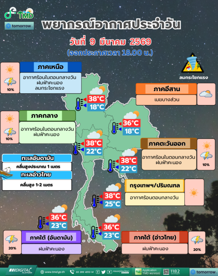 เมื่อวันที่ 9 มีนาคม 2569 กรมอุตุนิยมวิทยา พยากรณ์อากาศ 24 ประเทศไทยตอนบนมีอากาศร้อนในตอนกลางวัน โดยมีฝนฟ้าคะนองกับมีลมกระโชกแรงบางแห่งโดยเฉพาะในภาคเหนือตอนบน เนื่องจากลมลมตะวันออกและลมตะวันออกเฉียงใต้พัดปกคลุมประเทศไทยตอนบน ในขณะที่มีแนวพัดสอบของลมตะวันตกเฉียงใต้และลมตะวันออกเฉียงใต้พัดปกคลุมภาคเหนือ ขอให้ประชาชนบริเวณประเทศไทยตอนบนดูแลรักษาสุขภาพเนื่องจากสภาพอากาศที่ร้อน และระวังอันตรายจากฝนฟ้าคะนอง กับลมกระโชกแรงไว้ด้วย