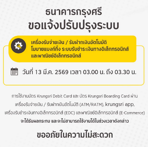 ธนาคารกรุงศรีอยุธยา จำกัด (มหาชน) ขอแจ้งปรับปรุงเครื่องรับจ่ายเงิน / รับฝากเงินอัตโนมัติ โมบายแบงก์กิ้ง ระบบรับชำระเงินทางอิเล็กทรอนิกส์ และพาณิชย์อิเล็กทรอนิกส์ ชั่วคราว เพื่อทำการปรับปรุงระบบ ในวันที่ 13 มี.ค. 69 เวลา 03.00 น. ถึง 03.30 น. บริการที่จะได้รับผลกระทบ และไม่สามารถใช้งานได้ มีดังนี้