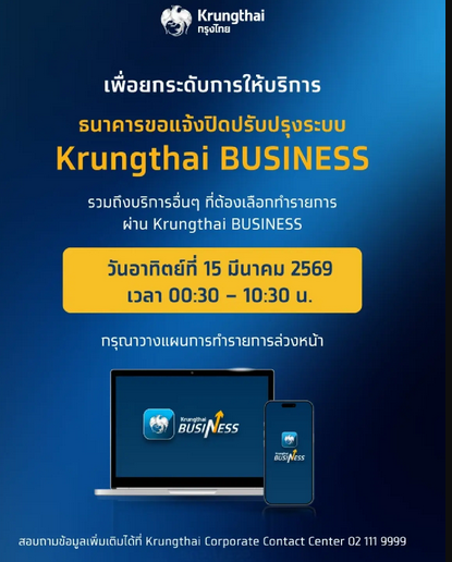 ธนาคารกรุงไทย เปิดเผยว่าเพื่อยกระดับการให้บริการ ธนาคารขอแจ้งปิดปรับปรุงระบบ Krungthai BUSINESS รวมถึงบริการอื่นๆ ที่ต้องเลือกทำรายการผ่าน Krungthai BUSINESS ในวันอาทิตย์ที่ 15 มีนาคม 2569 เวลา 00.30 – 10.30 น. กรุณาวางแผนการทำรายการล่วงหน้า