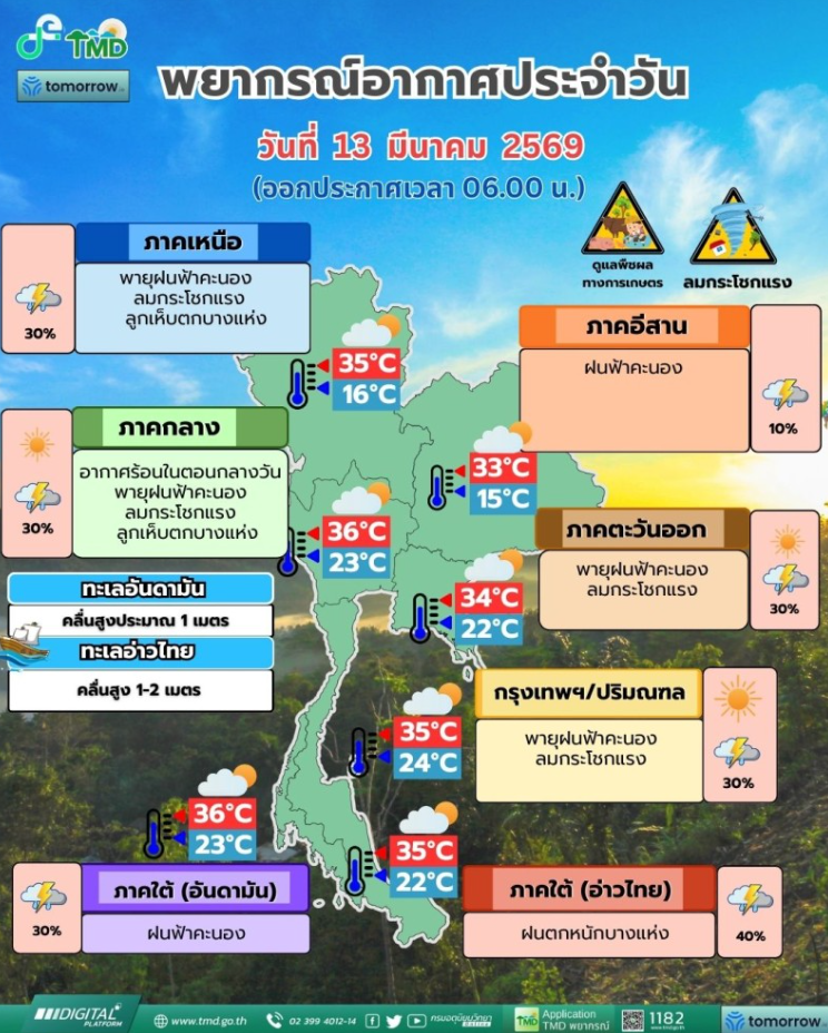 วันที่ 13 มีนาคม 2569 กรมอุตุนิยมวิทยา พยากรณ์อากาศ 24 ชั่วโมงข้างหน้า ภาคเหนือ ภาคกลาง ภาคตะวันออกรวมทั้งกรุงเทพมหานครและปริมณฑล ยังคงมีพายุฤดูร้อนเกิดขึ้นได้บางพื้นที่ โดยมีลักษณะของพายุฝนฟ้าคะนอง ลมกระโชกแรง และลูกเห็บตก รวมถึงฟ้าผ่าที่อาจเกิดขึ้นได้บางพื้นที่ เนื่องจากคลื่นกระแสลมฝ่ายตะวันตกจากประเทศเมียนมายังคงปกคลุมภาคเหนือ