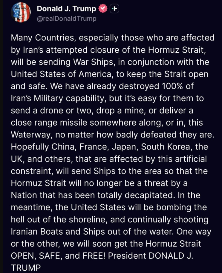 อย่างไรก็ตามในระหว่างนี้ สหรัฐอเมริกาจะทำการทิ้งระเบิดถล่มชายฝั่งของพวกอิหร่านให้สิ้นซาก และจะสอยเรือของอิหร่านให้ร่วงจมลงก้นทะเลไปเรื่อย ๆ อย่างต่อเนื่อง ไม่ว่าจะด้วยวิธีใดก็ตาม เราจะทำให้ช่องแคบฮอร์มุซ เปิดกว้าง ปลอดภัย และมีเสรี ในเร็ว ๆ นี้อย่างแน่นอน ประธานาธิบดี โดนัลด์ เจ. ทรัมป์