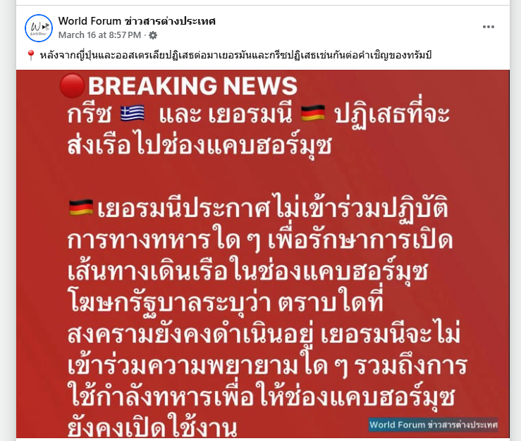 เมื่อวันที่ 16 มีนาคม 2569 ที่ผ่านมา เพจเฟซบุ๊ก World Forum ข่าวสารต่างประเทศ รายงานว่า หลังจากญี่ปุ่นและออสเตรเลียปฏิเสธคำเชิญของทรัมป์ ล่าสุดเยอรมนีและกรีซก็ประกาศไม่ตอบรับคำเชิญดังกล่าวเช่นกัน