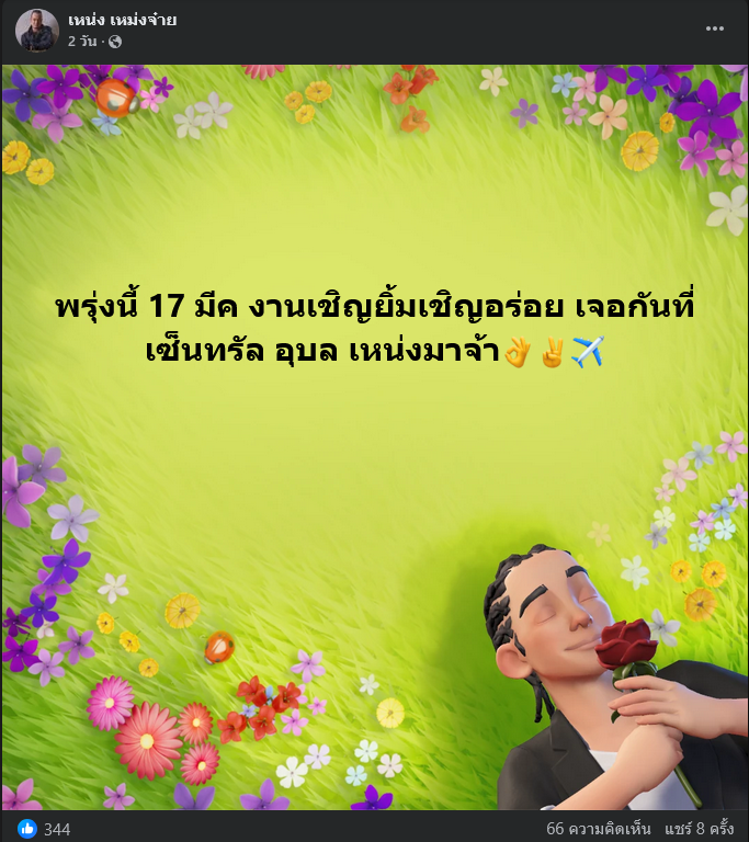 อย่างไรก็ตามจากการจรวจสอบเพจเฟซบุ๊ก เหน่ง เหม่งจ๋าย โพสต์สุดท้ายเมื่อวันที่ 16 มีนาคม 2569 ที่ผ่านมา ระบุว่า พรุ่งนี้ 17 มีค งานเชิญยิ้มเชิญอร่อย เจอกันที่ เซ็นทรัล อุบล เหน่งมาจ้า