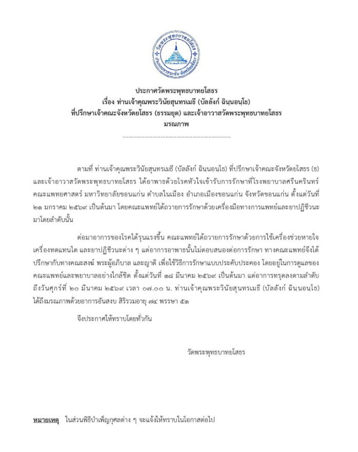 วันที่ 20 มีนาคม 2569 เพจเฟซบุ๊ก วัดพระพุทธบาทยโสธร ได้แจ้งข่าวการมรณภาพของพระวินัยสุนทรเมธี (หลวงพ่อบัลลังก์ ฉินนอันโธ) ที่ปรึกษาเจ้าคณะจังหวัดยโสธร (ธรรมยุต) และเจ้าอาวาสวัดพระพุทธบาทยโสธร โดยมรณภาพอย่างสงบ สิริอายุ 74 ปี 51 พรรษา