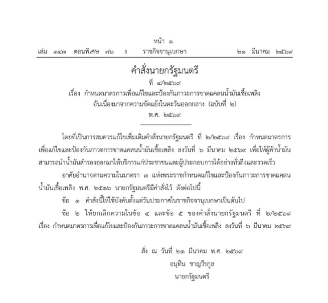 ข้อ 2 ให้ยกเลิกความในข้อ 4 และข้อ 5 ของคำสั่งนายกรัฐมนตรี ที่ 2/2569 เรื่อง กำหนดมาตรการเพื่อแก้ไขและป้องกันภาวะการขาดแคลนน้ำมันเชื้อเพลิง ลงวันที่ 6 มีนาคม 2569