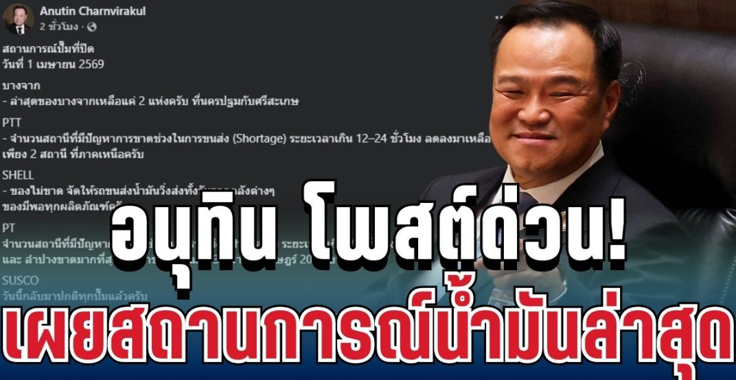วันที่ 1 เมษายน 2569 นายอนุทิน ชาญวีรกูล นายกรัฐมนตรี และรัฐมนตรีว่าการกระทรวงมหาดไทย โพสต์ข้อความผ่านเฟซบุ๊กส่วนตัว Anutin Charnvirakul อัปเดตสถานการณ์ปั๊มน้ำมันที่ปิดให้บริการในหลายพื้นที่ทั่วประเทศ หลังเกิดปัญหาการขนส่งน้ำมันขาดช่วงในวันเดียวกัน พร้อมสั่งการหน่วยงานที่เกี่ยวข้องเร่งแก้ไขโดยด่วน
