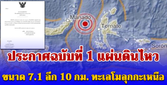 ขณะที่ นางสาวสุกันยาณี ยะวิญชาญ อธิบดีกรมอุตุนิยมวิทยา ออกประกาศฉบับที่ 1 เกิดแผ่นดินไหว จุดศูนย์กลางอยู่บริเวณ Northern Molucca Sea ทางตะวันออกเฉียงเหนือของอินโดนีเซีย ที่ละติจูด 1.290 องศาเหนือ ลองจิจูด 126.310 องศาตะวันออก ขนาด 7.1 ความลึก 10 กิโลเมตร เบื้องต้นไม่ส่งผลกระทบต่อประเทศไทย หากมีรายละเอียดเพิ่มเติม จะแจ้งให้ทราบโดยด่วนต่อไป