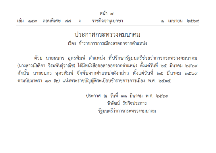 ด้วย นายธนกร อุดรพิมพ์ ตำแหน่ง ที่ปรึกษารัฐมนตรีช่วยว่าการกระทรวงคมนาคม (นางสาวมัลลิกา จิระพันธุ์วาณิช) ได้มีหนังสือขอลาออกจากตำแหน่ง ตั้งแต่วันที่ 25 มีนาคม 2569