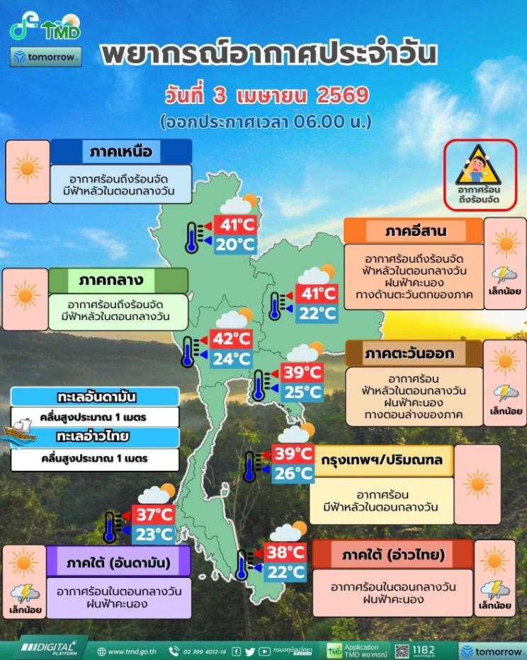 วันที่ 3 เมษายน 2569 กรมอุตุนิยมวิทยา พยากรณ์อากาศ 24 ชั่วโมงข้างหน้า ประเทศไทยตอนบนมีอากาศร้อนโดยทั่วไป กับมีฟ้าหลัวในตอนกลางวัน และมีอากาศร้อนจัดบางพื้นที่ในภาคเหนือ ภาคตะวันออกเฉียงเหนือ และภาคกลาง เนื่องจากความกดอากาศต่ำเนื่องจากความร้อนปกคลุมประเทศไทยตอนบน ในขณะที่มีลมใต้และลมตะวันตกเฉียงใต้กำลังอ่อนพัดปกคลุมในบริเวณดังกล่าว ทำให้ประเทศไทยตอนบนยังคงมีฝนฟ้าคะนองเล็กน้อยบางแห่ง ขอให้ประชาชนดูแลรักษาสุขภาพเนื่องจากสภาพอากาศที่ร้อนถึงร้อนจัด โดยหลีกเลี่ยงการทำงานหรือการประกอบกิจกรรมในที่โล่งแจ้งเป็นระยะเวลานาน รวมทั้งระวังอันตรายจากฝนฟ้าคะนองที่อาจเกิดขึ้นในบางพื้นที่ไว้ด้วย