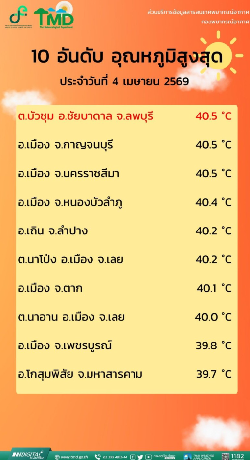 เมื่อวันที่ 4 เมษายน 2569 ที่ผ่านมา กรมอุตุนิยมวิทยา ได้ประกาศแจ้งผ่านเฟซบุ๊ก โดยระบุว่า 10 อันดับอุณหภูมิสูงสุด ประจำวันที่ 4 เมษายน 2569