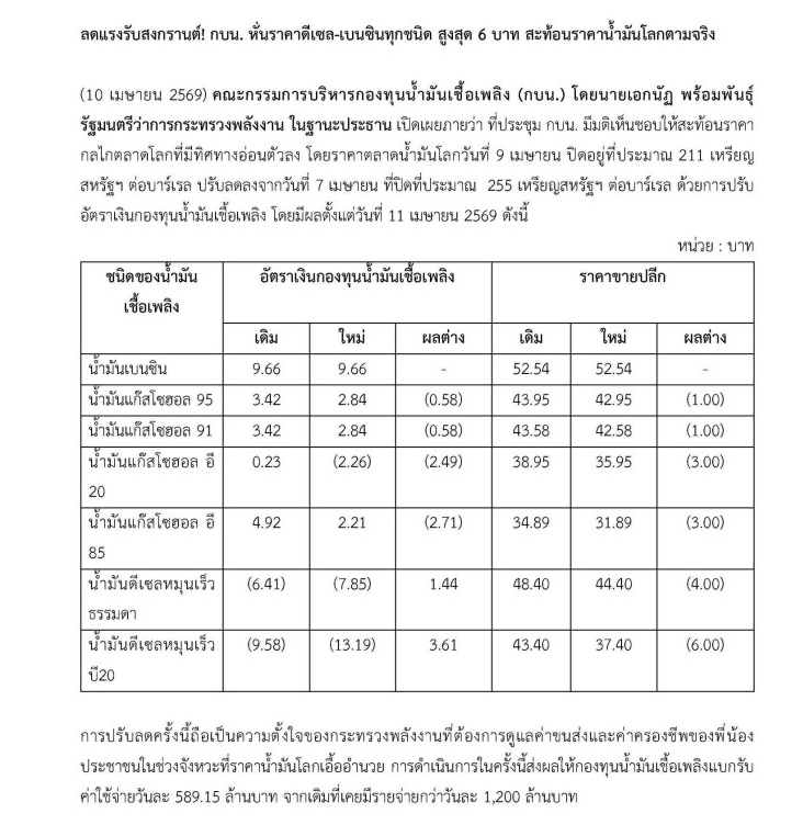 กบน. ปรับลดราคาน้ำมันขายปลีกทั้งกลุ่มเบนซิน-ดีเซล สะท้อนกลไกตลาดโลกที่ปรับตัวลดลง มีผล 11 เม.ย. 69