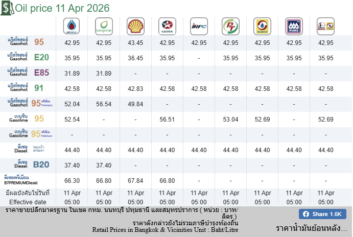 อัปเดตราคาน้ำมัน วันที่ 11 เม.ย. 2569 มีผลตั้งแต่เวลา 05.00 น.