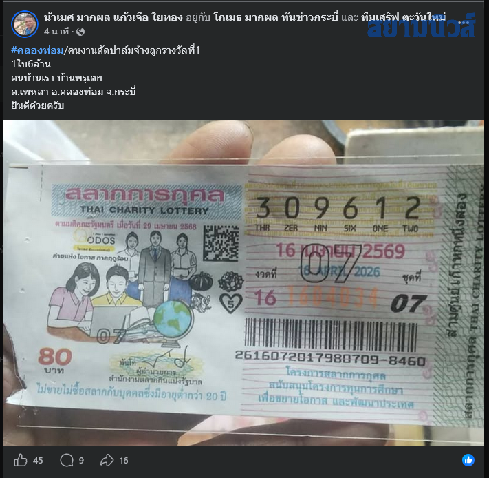 ขณะที่ทางเพจเฟซบุ๊ก น้าเมศ มากผล แก้วเจือ ใยทอง ได้โพสต์ภาพลอตเตอรี่รางวัลที่ 1 พร้อมระบุข้อความว่า คลองท่อม คนงานตัดปาล์มจ้างถูกรางวัลที่1 1ใบ6ล้าน คนบ้านเรา บ้านพรุเตย ต.เพหลา อ.คลองท่อม จ.กระบี่ ยินดีด้วยครับ