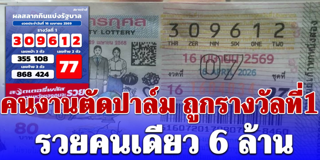 ภายหลังจากการออกรางวัล สลากกินแบ่งรัฐบาล งวดประจำวันที่ 16 เมษายน 2569 โดยรางวัลที่ 1 หมายเลข 309612 เลขหน้า 3 ตัว หมายเลข 355 และ 108 เลขท้าย 3 ตัว 868 และ 424 เลขท้าย 2 ตัว หมายเลข 77