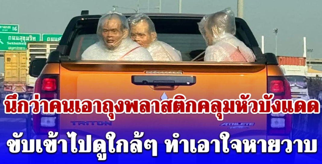 กลายเป็นภาพไวรัลที่ถูกพูดถึงในโลกโซเชียล เมื่อผู้ใช้เฟซบุ๊กรายหนึ่งชื่อ Jobby ได้โพสต์ภาพขณะขับรถอยู่บนถนน แล้วบังเอิญเหลือบไปเห็นรถกระบะคันหนึ่งวิ่งอยู่ด้านหน้า โดยมีลักษณะสะดุดตาคือมี “คน” นั่งอยู่ท้ายกระบะ แต่กลับใช้ถุงพลาสติกคลุมศีรษะเอาไว้