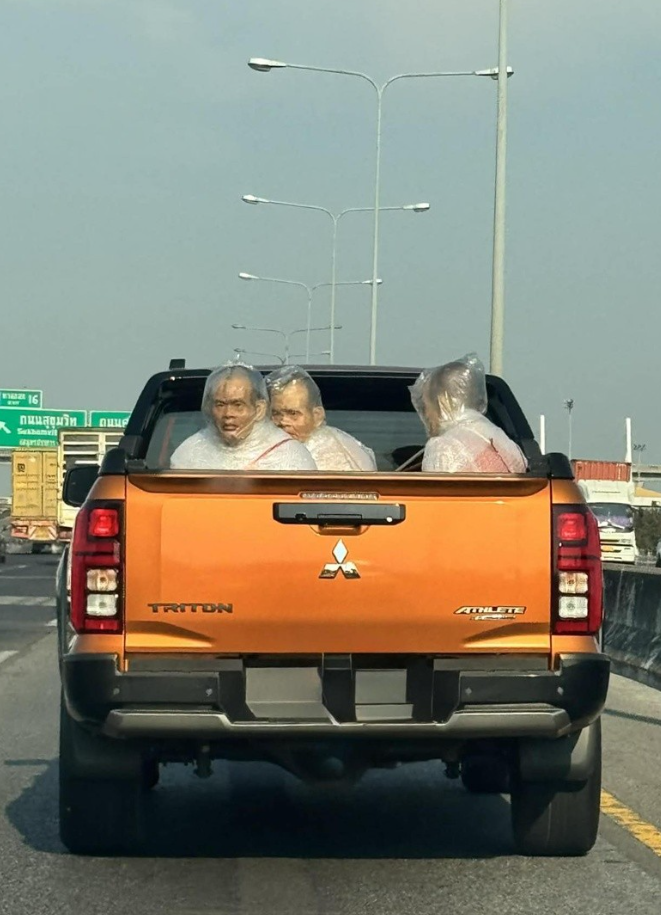 เจ้าของโพสต์เล่าว่า ตอนแรกที่เห็นถึงกับตกใจเล็กน้อย คิดไปต่าง ๆ นานา อาจจะเป็นการกันแดดหรือป้องกันฝุ่น PM 2.5 แต่เมื่อขับเข้าไปใกล้และมองดี ๆ ถึงกับต้องขยี้ตา เพราะสิ่งที่เห็นนั้นไม่ใช่คนจริง แต่เป็น หุ่นขี้ผึ้งพระ ที่ถูกขนย้ายอยู่ด้านหลังรถ