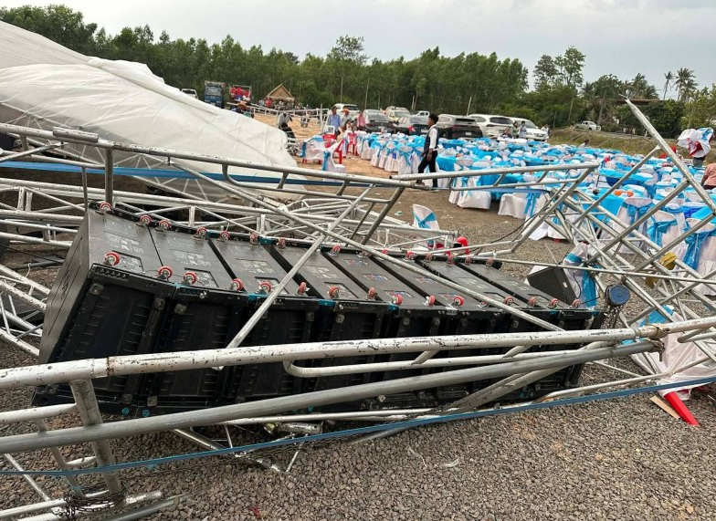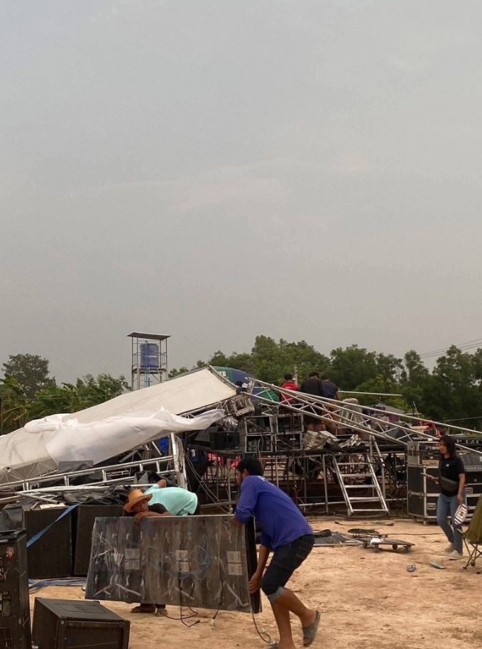 โดยงานดังกล่าว เจ้าภาพได้จัดเลี้ยงโต๊ะจีนสำหรับงานขึ้นบ้านใหม่ เพื่อเลี้ยงรับรองแขกเหรื่อที่มารวมงาน ทั้งเวทีเครื่องสร้างความสนุกบันเทิง แต่กลับถูกพายุฤดูร้อนทำลายงานอย่างไม่คาดคิด ก่อนการแสดงบนเวทีจะเริ่ม ทำให้ผู้มาร่วมงานต้องวิ่งหนีเอาชีวิตรอดกันอลหม่าน โชคดีที่ไม่มีใครได้รับบาดเจ็บ ส่วนความเสียหายของเวทีเครื่องเสียงถูกลมและฝนพัดกระหน่ำจนเต็นท์เวทีและลำโพงล้มระเนระนาด โต๊ะเก้าอี้กระจัดกระจาย ต่างสงสารและใจเจ้าภาพเป็นอย่างมาก