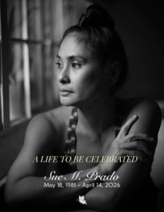 จากสื่อต่างประเทศ ได้รายงานว่า Sue Prado นักแสดงหญิงชาวฟิลิปปินส์ มากความสามารถ เสียชีวิตลงในวัย 44 ปี เมื่อวันอังคารที่ 14 เมษายน ที่ผ่านมา โดย เมย์ เชอรีน ปราโด (May Shereen Prado) น้องสาวของเธอโพสต์ข้อความยืนยันข่าวเศร้าผ่านเฟซบุ๊ก ระบุว่าพี่สาวผู้เป็นที่รักได้กลายเป็นดวงดาวที่ส่องแสงคงที่บนท้องฟ้ายามค่ำคืน ครอบครัวขอแจ้งข่าวการจากไปของเธอด้วยความเจ็บปวดอย่างสุดซึ้ง