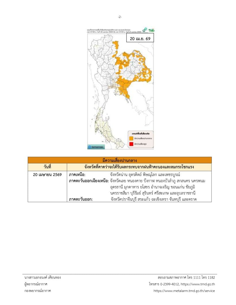 จึงขอให้ประชาชนติดตามประกาศจากกรมอุตุนิยมวิทยาและสามารถติดตามข้อมูลที่เว็บไซต์กรมอุตุนิยมวิทยา http://www.tmd.go.th หรือที่ 0-2399-4012-13 และ 1182 ได้ตลอด 24 ชั่วโมง ประกาศ ณ วันที่ 20 เมษายน พ.ศ. 2569 เวลา 11.00 น. กรมอุตุนิยมวิทยาจะออกประกาศฉบับนี้เป็นฉบับสุดท้ายของเหตุการณ์นี้