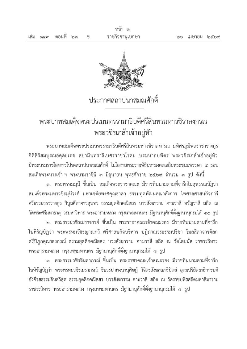 เมื่อวันที่ 20 เมษายน 2569 มีรายงานว่า เว็บไซต์ ราชกิจจานุเบกษา ได้เผยเเพร่ ประกาศสถาปนาสมณศักดิ์ พระบาทสมเด็จพระปรเมนทรรามาธิบดีศรีสินทรมหาวชิราลงกรณ พระวชิรเกล้าเจ้าอยู่หัว โดยประกาศดังกล่าว มีเนื้อหาระบุว่า พระบาทสมเด็จพระปรเมนทรรามาธิบดีศรีสินทรมหาวชิราลงกรณ มหิตรภูมิพลราชวรางกูร กิตติสิริสมบูรณอดุลยเดช สยามินทราธิราช บรมนาถบพิตร พระวชิรเกล้าเจ้าอยู่หัว มีพระบรมราชโองการโปรดสถาปนาสมณศักดิ์ ในโอกาสพระราชพิธีมหามงคลเฉลิมพระชนมพรรษา 4 รอบ สมเด็จพระนางเจ้า ฯ พระบรมราชินี 3 มิถุนายน พุทธศักราช 2569 จำนวน 3 รูป ดังนี้