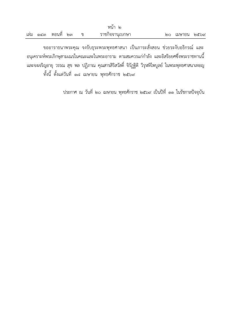 ขออาราธนาพระคุณ จงรับธุระพระพุทธศาสนา เป็นภาระสั่งสอน ช่วยระงับอธิกรณ์ และ อนุเคราะห์พระภิกษุสามเณรในคณะและในพระอาราม ตามสมควรแก่กำลัง และอิสริยยศซึ่งพระราชทานนี้ และจงเจริญอายุ วรรณ สุข พล ปฏิภาณ คุณสารสิริสวัสดิ์ จิรัฏฐิติ วิรุฬหึไพบูลย์ ในพระพุทธศาสนาเทอญ ทั้งนี้ ตั้งแต่วันที่ 18 เมษายน พุทธศักราช 2569 ประกาศ ณ วันที่ 20 เมษายน พุทธศักราช 2569 เป็นปีที่ 11 ในรัชกาลปัจจุบัน