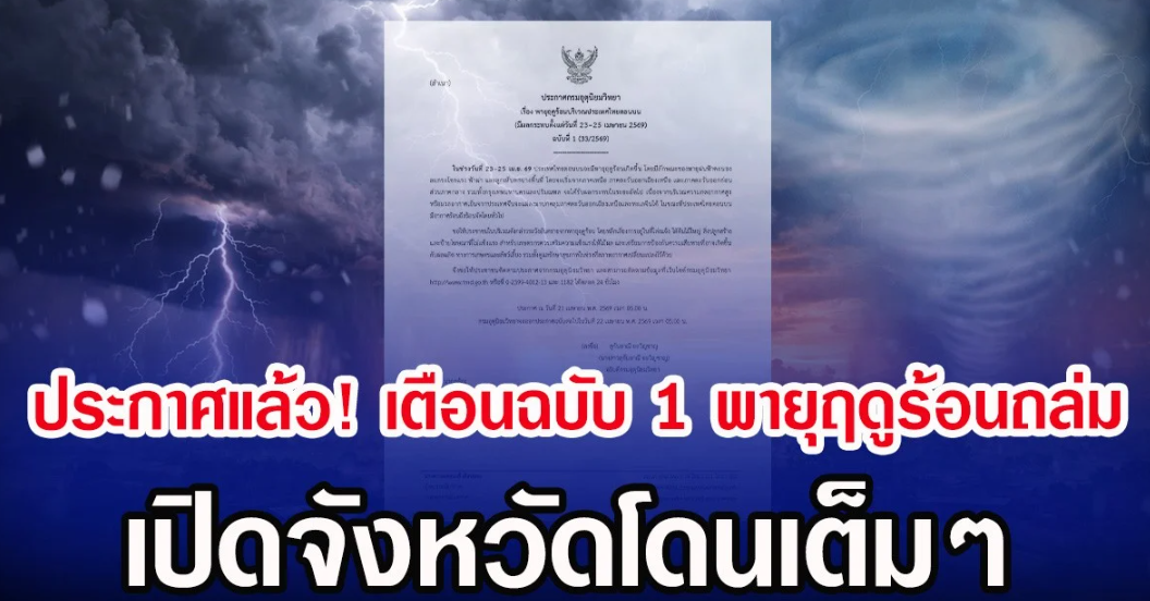 วันที่ 21 เม.ย.2569 กรมอุตุนิยมวิทยา ประกาศ เรื่อง พายุฤดูร้อนบริเวณประเทศไทยตอนบน (มีผลกระทบตั้งแต่วันที่ 23-25 เมษายน 2569) ฉบับที่ 1 (33/2569) ระบุว่า ในช่วงวันที่ 23-25 เม.ย. 69 ประเทศไทยตอนบนจะมีพายุฤดูร้อนเกิดขึ้น โดยมีลักษณะของพายุฝนฟ้าคะนอง ลมกระโชกแรง ฟ้าผ่า และลูกเห็บตกบางพื้นที่