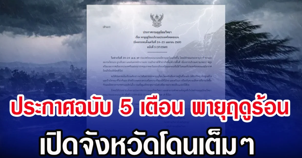 วันที่ 24 เมษายน 2569 กรมอุตุนิยมวิทยา พยากรณ์อากาศ ในช่วงวันที่ 24–25 เม.ย. 69 ประเทศไทยตอนบนจะมีพายุฤดูร้อนเกิดขึ้น โดยมีลักษณะของพายุฝนฟ้าคะนอง ลมกระโชกแรง ลูกเห็บตก และฝนตกหนักบางแห่ง รวมถึงอาจมีฟ้าผ่าเกิดขึ้นได้บางพื้นที่ เนื่องจากบริเวณความกดอากาศสูงหรือมวลอากาศเย็นจากประเทศจีนแผ่ลงมาปกคลุมภาคตะวันออกเฉียงเหนือและทะเลจีนใต้ ในขณะที่ประเทศไทยตอนบนมีอากาศร้อนถึงร้อนจัดโดยทั่วไป