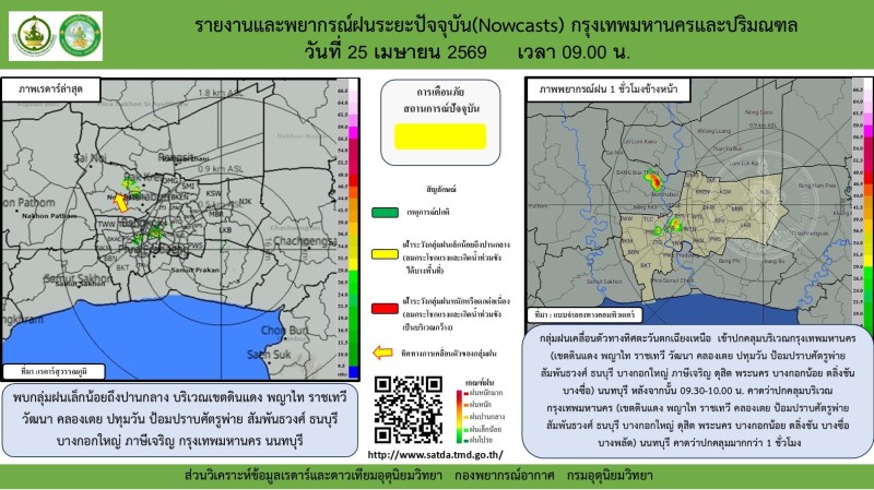 วันที่ 25 เม.ย. 25469 กรมอุตุนิยมวิทยาได้ประกาศแจ้ง พบกลุ่มฝนเล็กน้อยถึงปานกลาง บริเวณเขตดินแดง พญาไท ราชเทวี วัฒนา คลองเตย ปทุมวัน ป้อมปราบศัตรูพ่าย สัมพันธวงศ์ ธนบุรี บางกอกใหญ่ ภาษีเจริญ กรุงเทพมหานคร นนทบุรี