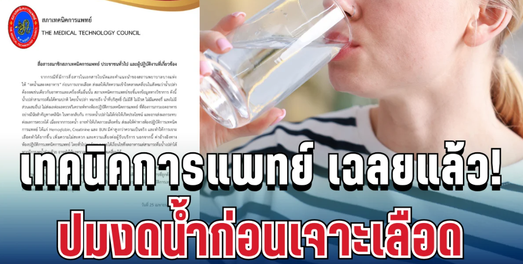 วันที่ 25 เมษายน 2569 ที่ผ่านมา สภาเทคนิคการแพทย์ ออกแถลงการณ์ชี้แจงกรณีความเข้าใจคลาดเคลื่อนเกี่ยวกับการงดน้ำก่อนเจาะเลือด หลังพบสถานพยาบาลบางแห่งสื่อสารในเอกสารใบนัดและคำแนะนำให้ งดน้ำและงดอาหาร จนประชาชนเข้าใจผิดว่าน้ำเปล่าต้องงดด้วย